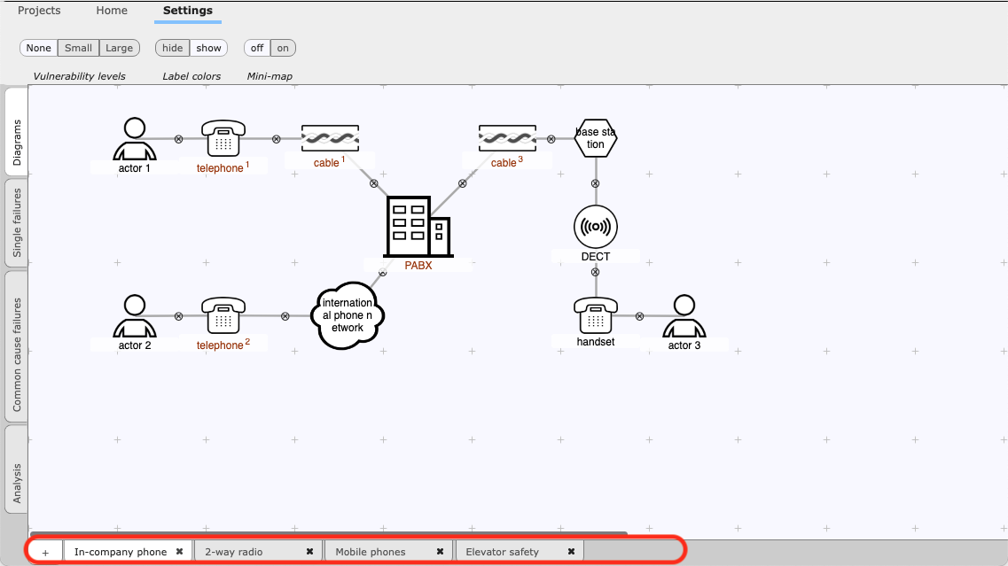You can use labels to organise nodes. For example, you can label nodes to mark them as 'under review' or to record additional information that is not normally part of the diagrams, such as ownership, responsibility or physical location. Each label is visually indicated in the diagrams using a colour (to disable this, use the setting in the Settings toolbar. Note that these colours have no relation with the colours that are associated with vulnerability levels.